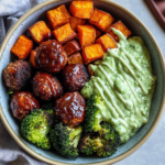 Healthy, wholesome Barbecue Meatball Bowls with Avocado Goddess Sauce are a vibrant and delicious meal that suits any occasion. This dish features saucy barbecue meatballs, roasted sweet potatoes, quinoa, and tender broccoli, all topped with a creamy avocado goddess sauce. Packed with protein, healthy fats, fiber, and complex carbs, these bowls will keep you energized throughout the day. Best of all, they are bursting with flavor and color!
