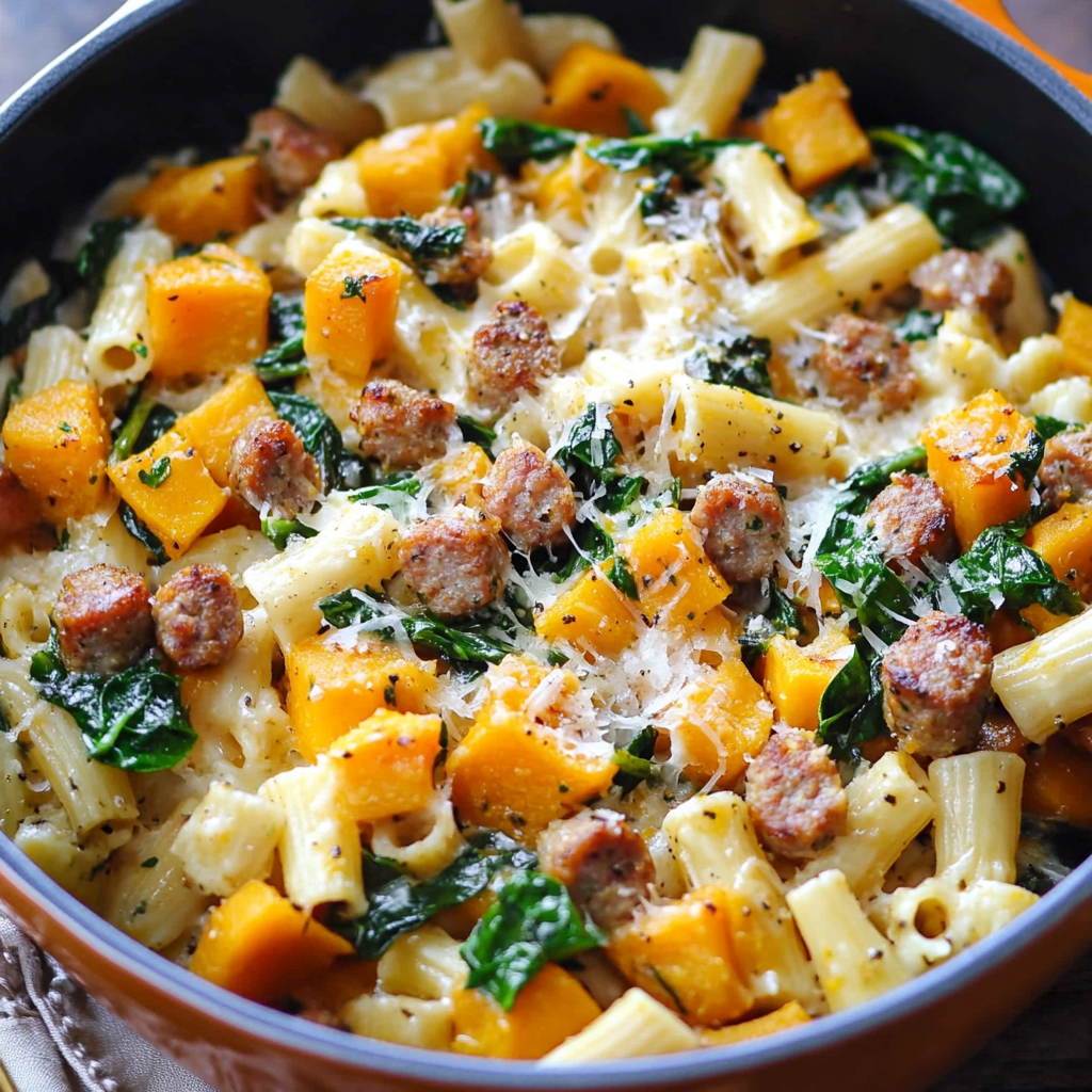 Creamy Roasted Butternut Squash Pasta with turkey Sausage and Spinach