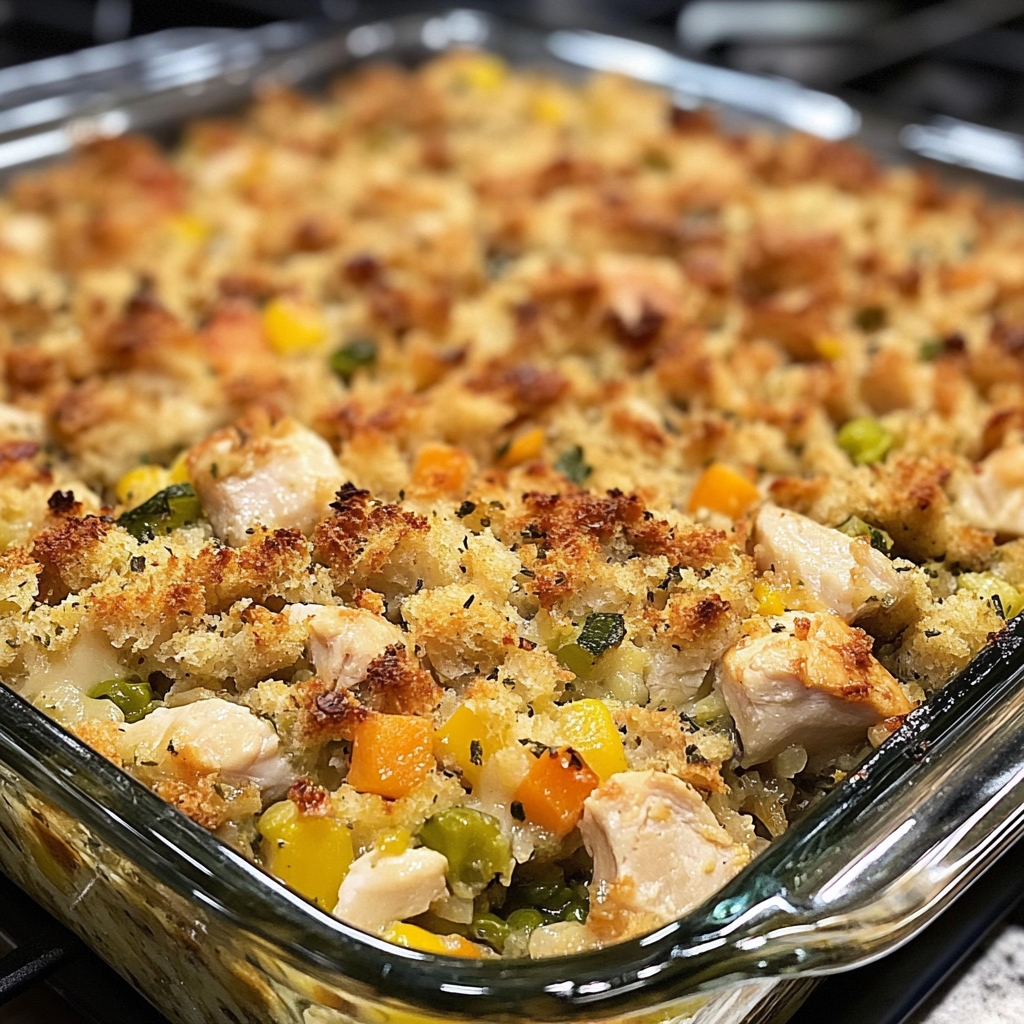 A Chicken and Stuffing Casserole Recipe is a one-pan dish that combines diced chicken, creamy soup, vegetables, and seasoned stuffing baked together for a hearty meal.