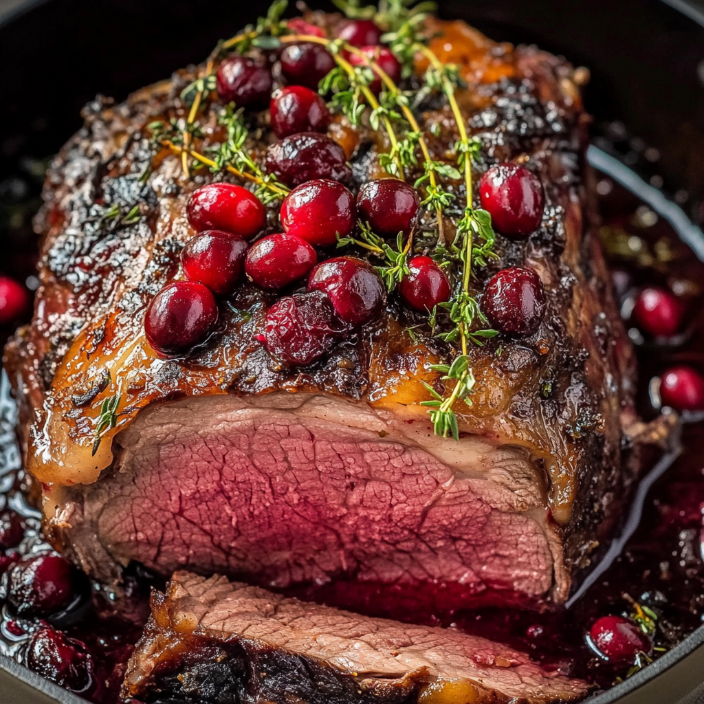 Cranberry Balsamic Roast Beef is a savory dish featuring tender beef marinated with balsamic vinegar, garlic, cranberry sauce, and spices, roasted until perfectly cooked.