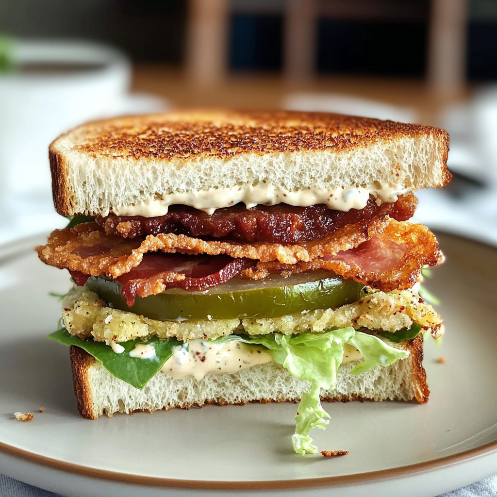 Sink your teeth into the Crunchy Fried Green Tomato Club Sandwich, a delightful twist on the classic Crunchy Fried Green Tomato Club Sandwich that promises to elevate your lunch or dinner. This sandwich features crispy fried green tomatoes paired with savory turkey bacon, layered between slices of soft bread and enhanced by a zesty sauce. Each bite delivers a satisfying crunch and a burst of flavor, making it perfect for summer picnics or cozy dinners at home. Impress your family and friends with this innovative recipe that combines unique textures and tastes effortlessly.