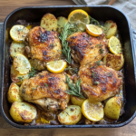 Enjoy Greek lemon chicken with potatoes, featuring a zesty lemon-olive oil marinade and aromatic spices. Baked to crispy golden perfection!
