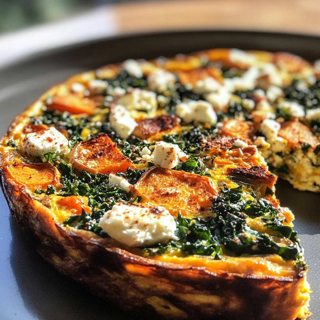 A hearty and nutritious frittata combining roasted sweet potatoes, kale, and feta cheese for a flavorful breakfast or brunch.