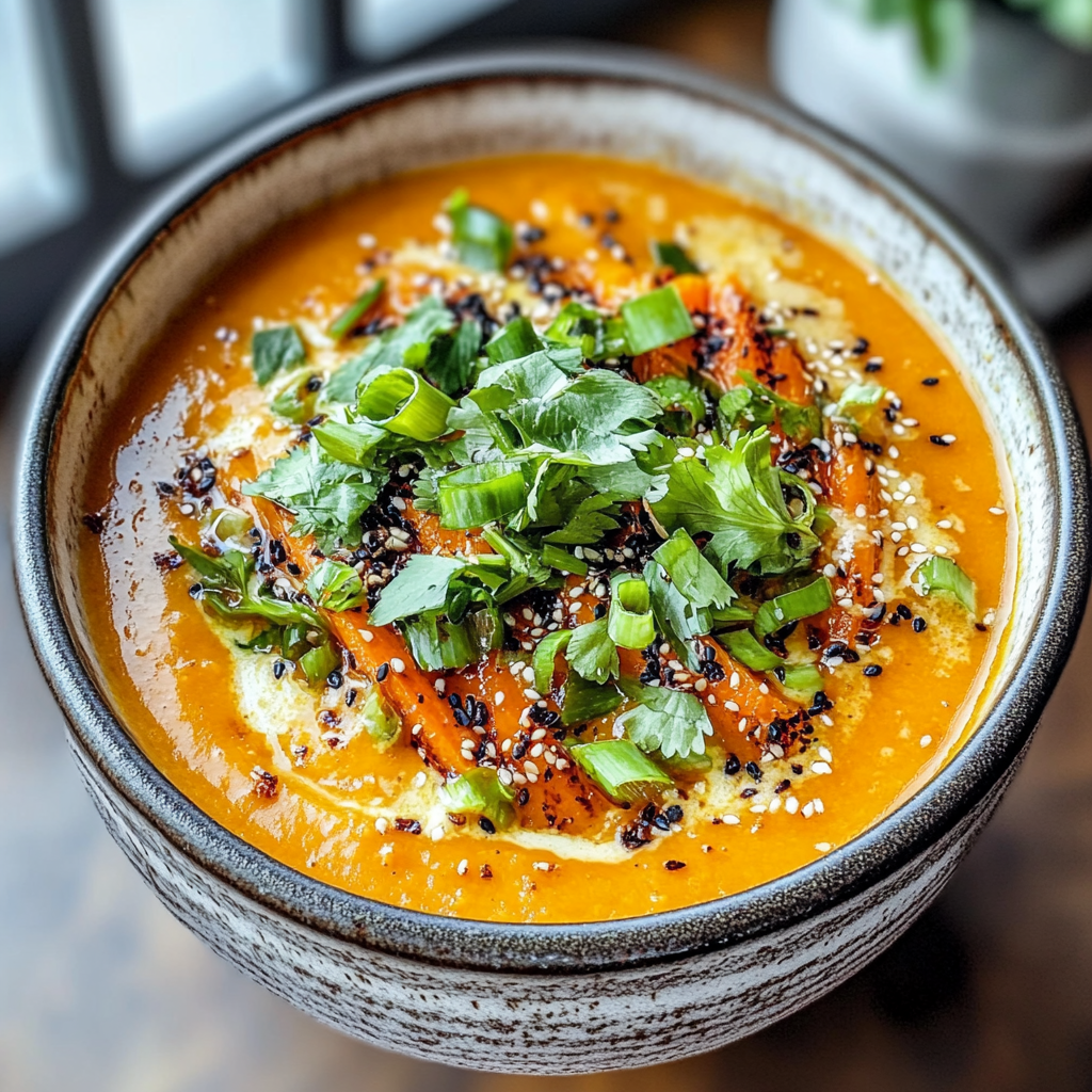 Indulge in this Spicy Miso Carrot Soup, a warm vegan dish that blends sweet carrots with rich coconut milk for ultimate comfort.