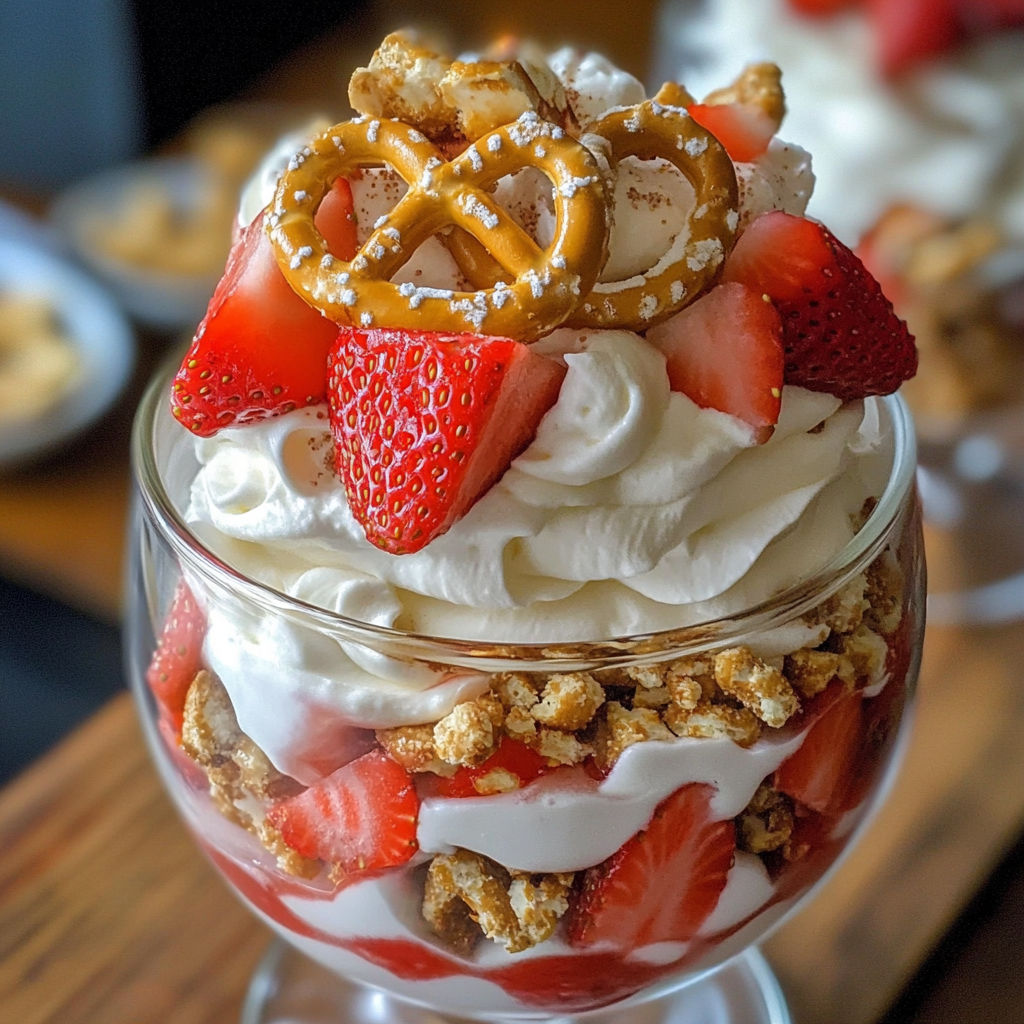 Strawberry Pretzel Salad Parfaits are a delightful dessert made with layers of whipped cream, fresh strawberries, and crunchy pretzels, offering a creamy and crunchy contrast.