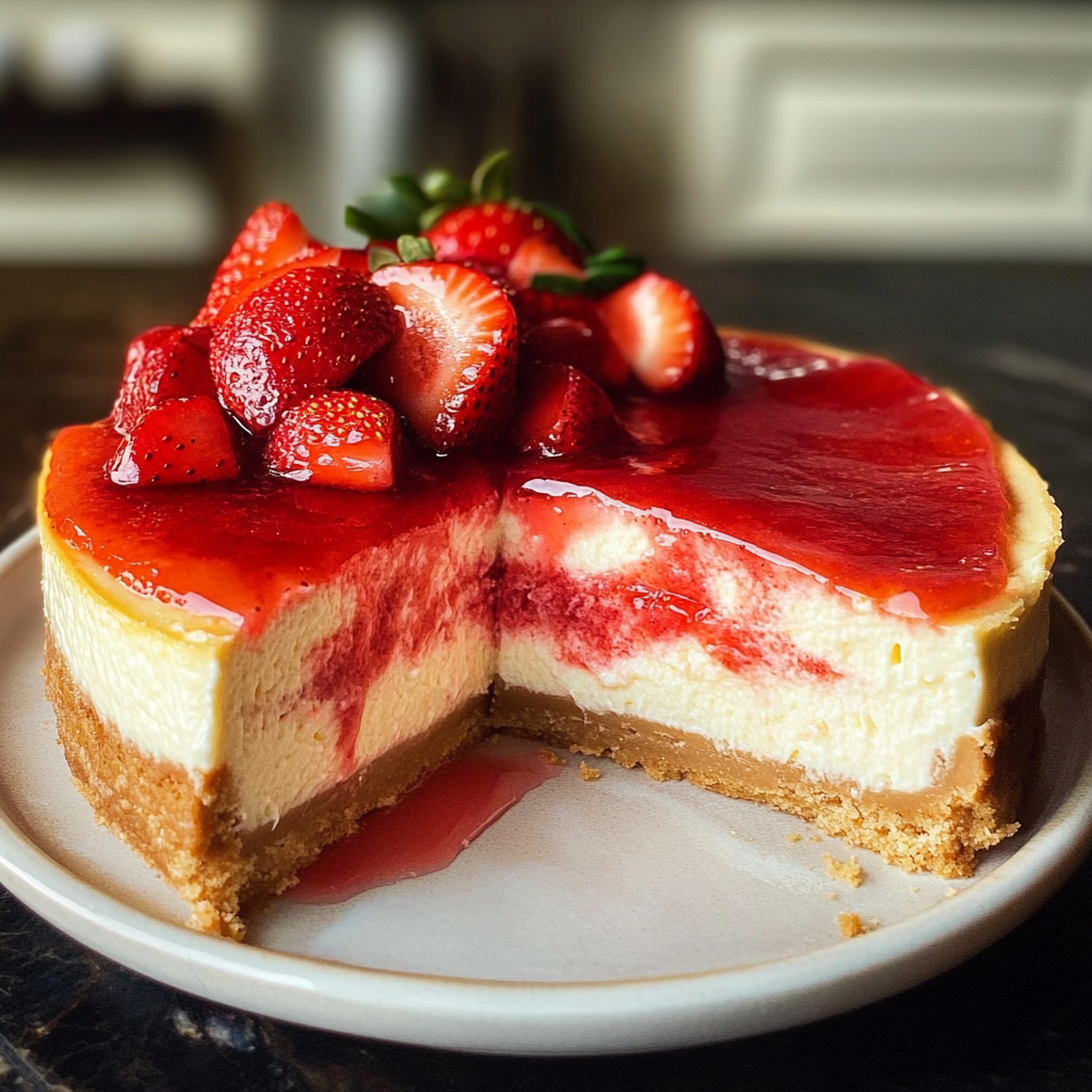 This recipe features a perfect balance of creamy cheesecake and fresh strawberry compote that elevates its flavor.